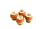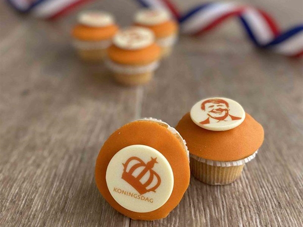 Oranje muffin bedekt met plakje marsepein en een koninklijk oranje chocolaatje.