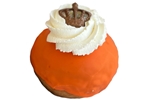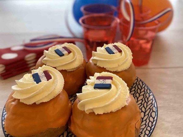 Luchtige soes vol verse slagroom, bedekt met oranje topping en een mooie rozet slagroom.