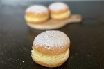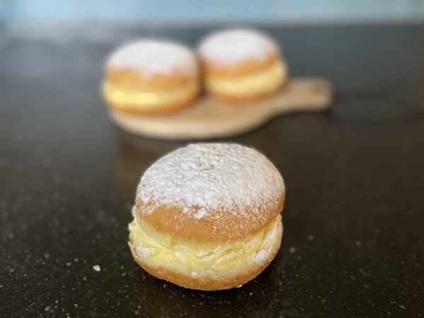 Zachte, zoete bol gevuld met banketbakkersroom en bestrooid met poedersuiker.